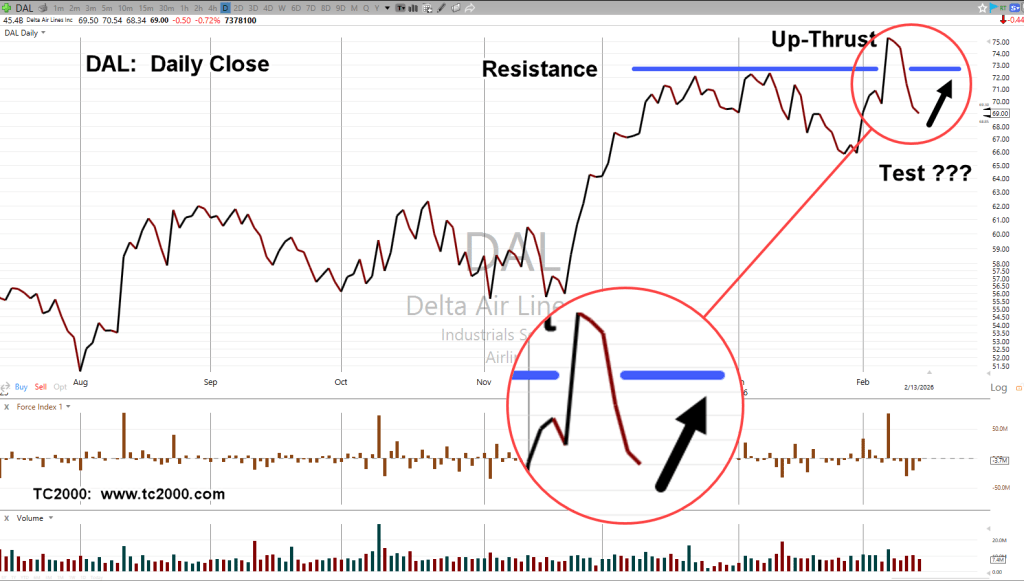 The failed breakout was observed in real time and traded to the short side as DAL-26-01.