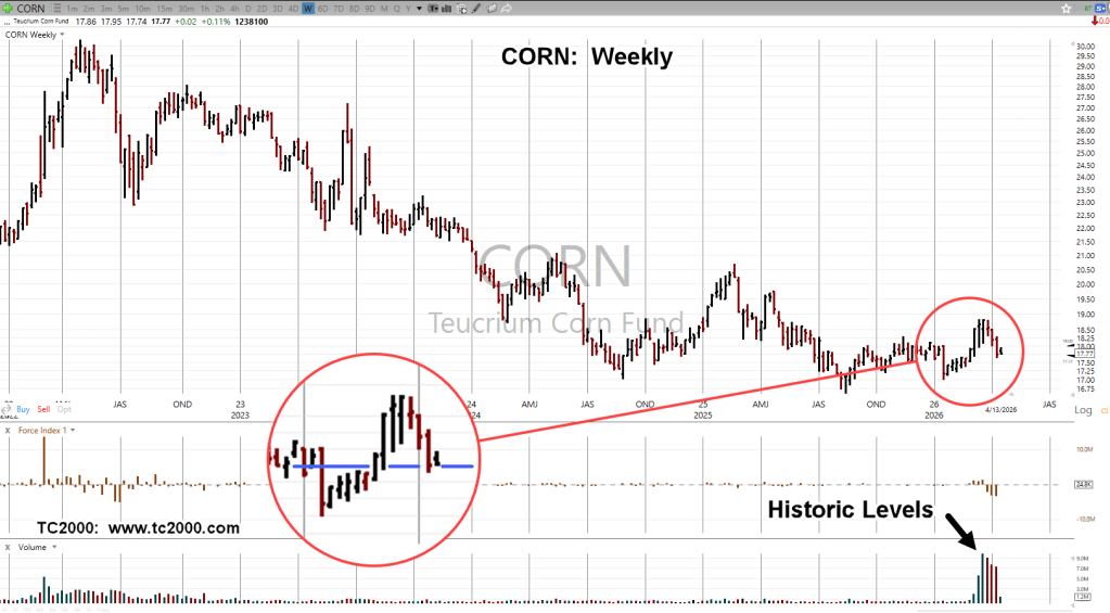 Trading in Teucrium Fund CORN, is at levels not seen in its history.