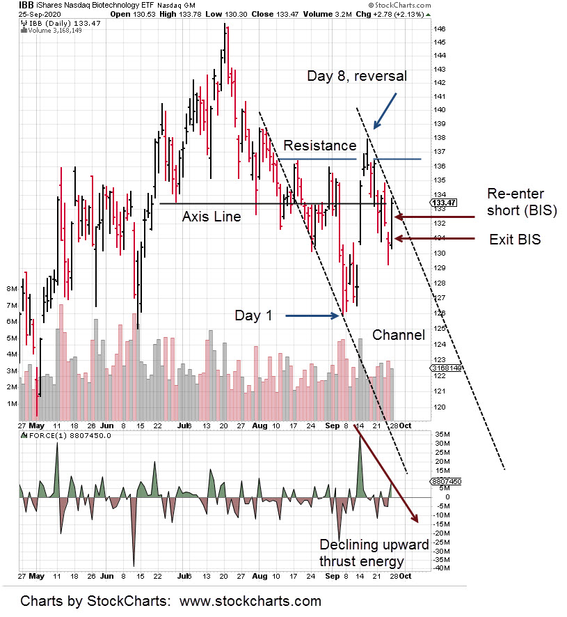 Getting back to the biotech short position; Later in the session, as IBB was rising, BIS declining, the short was re-established.