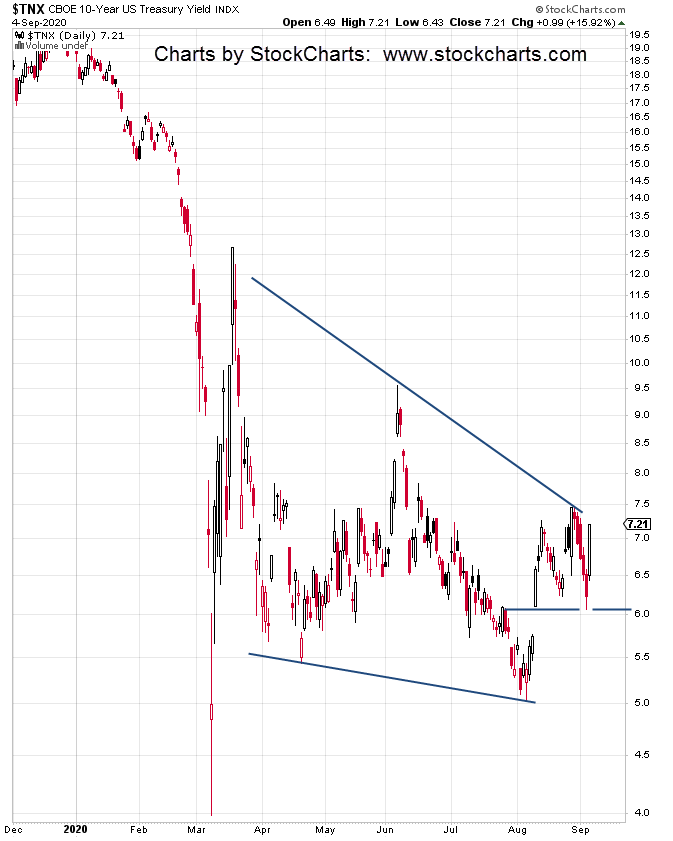 There are now two theories on the U.S. bond market (links below) and we’ve been monitoring that market closely. The bond action, TNX, looks like it’s about to break out with rates higher.