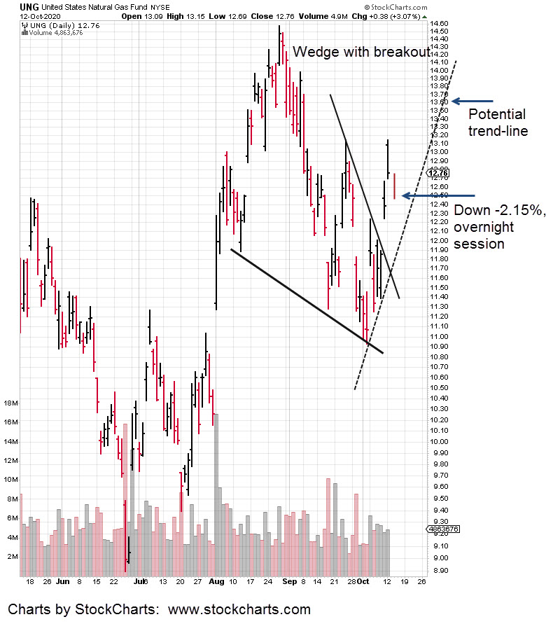 Based on that data, the daily chart of UNG has been updated to show where trading action is taking place overnight.