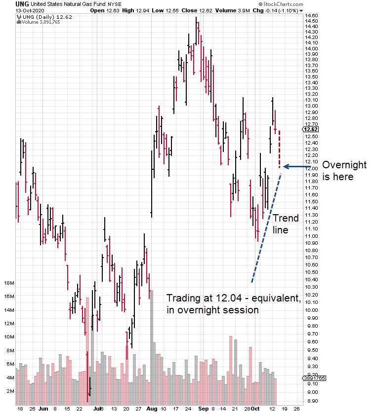 If the current position in the futures (NGX20) is maintained to the morning open, UNG will begin trading right around the 12.00 – area.