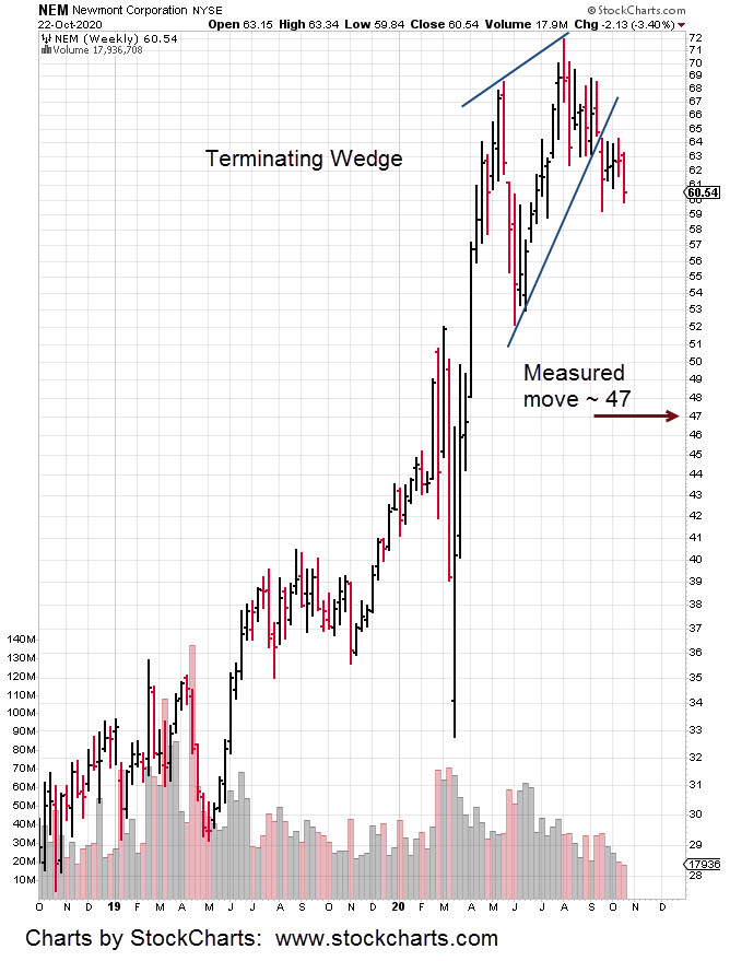 Prior updates have discussed the Newmont (NEM) bearish divergence and reversal. This update shows a rising wedge breakout to the downside.