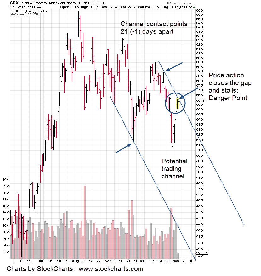 From the Junior Miners, GDXJ standpoint (chart above), we have what looks like a gap-fill; along with establishing a down-trend and possible trading channel.