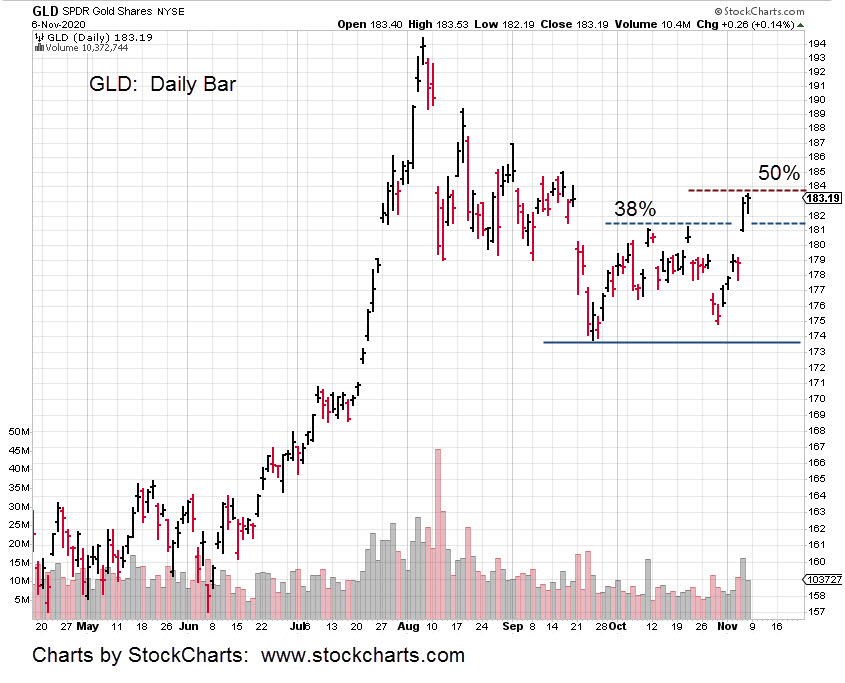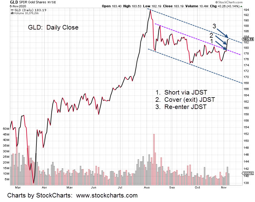 Even if the trade proves to be wrong, it’s a low probability that price action will break out of the GLD trading channel shown (below) in just one attempt.