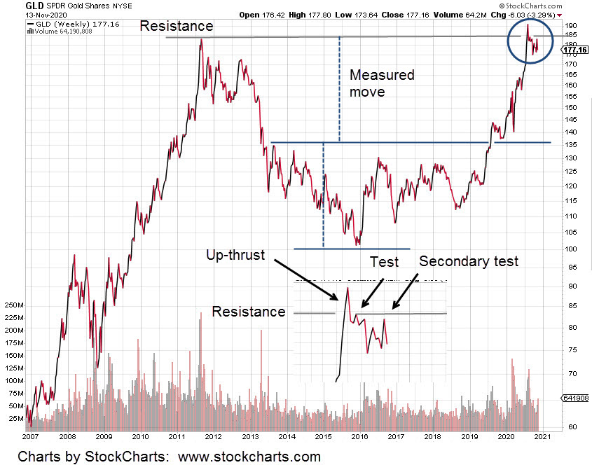The weekly chart of GLD below, shows the long-term action in the sector.