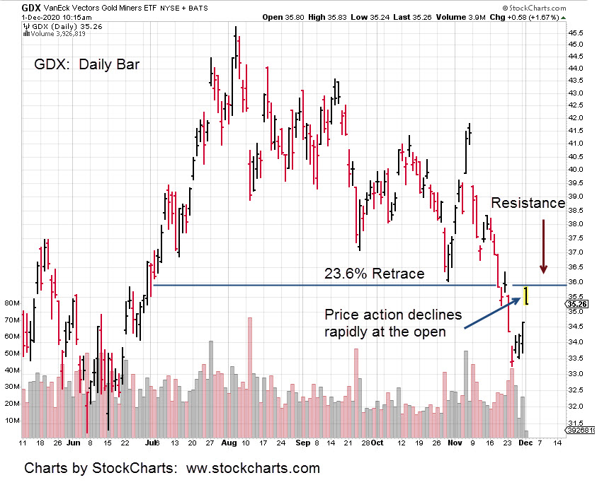 If so, and GDX closes lower than yesterday, it would indicate a high probability for a swift, decisive move to much lower levels..