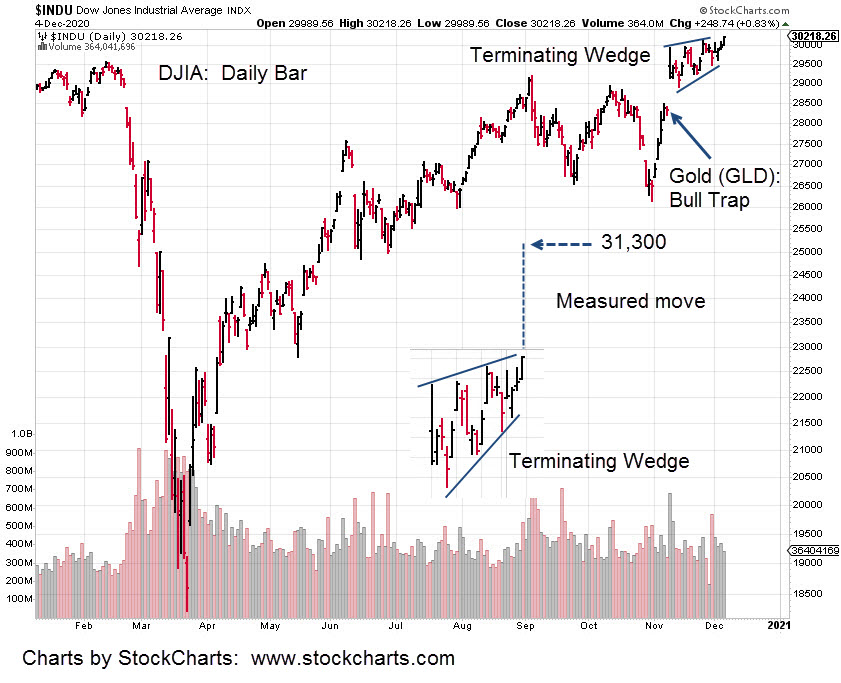 As the market opened with gold down hard, the Dow and S&P both spiked up in what’s now a terminal wedge.