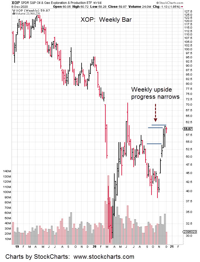 What’s really going on looks like a short-squeeze that may have played itself out. The Weekly chart of XOP (oil/gas production ETF) shows upside progress has stopped dead.