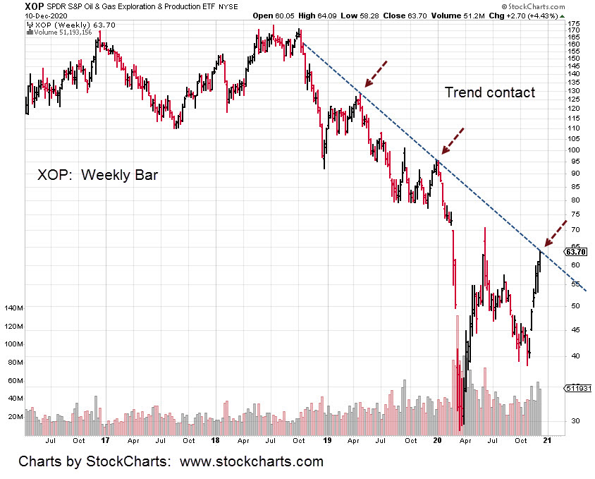Looking at XOP, we see it’s hitting a long-established trend line.