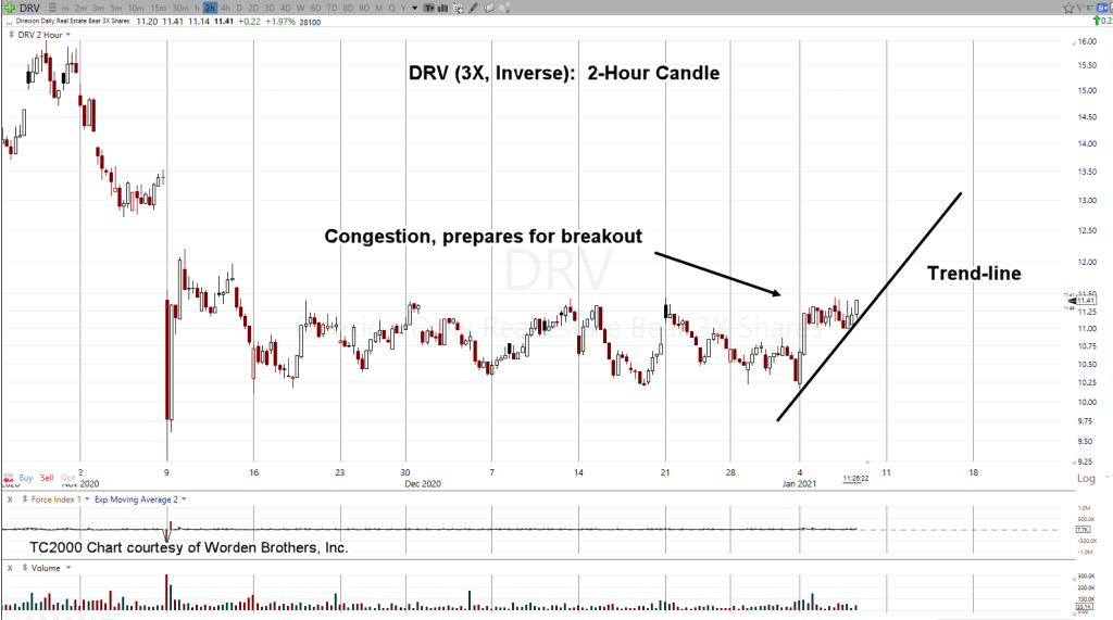 With the overall markets at new highs, and IYR dead-in-the-water, probabilities favor downside action (DRV higher).
