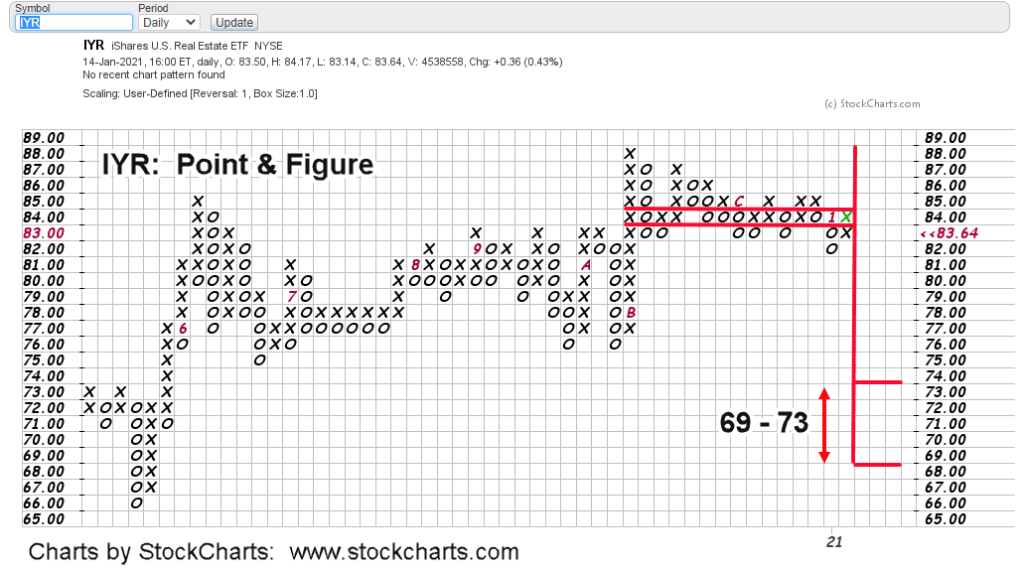 Which brings us back to real estate and IYR. The P&F chart shows us, if there’s a breakout to the downside, initial projection of the move is to support around 69 – 73.