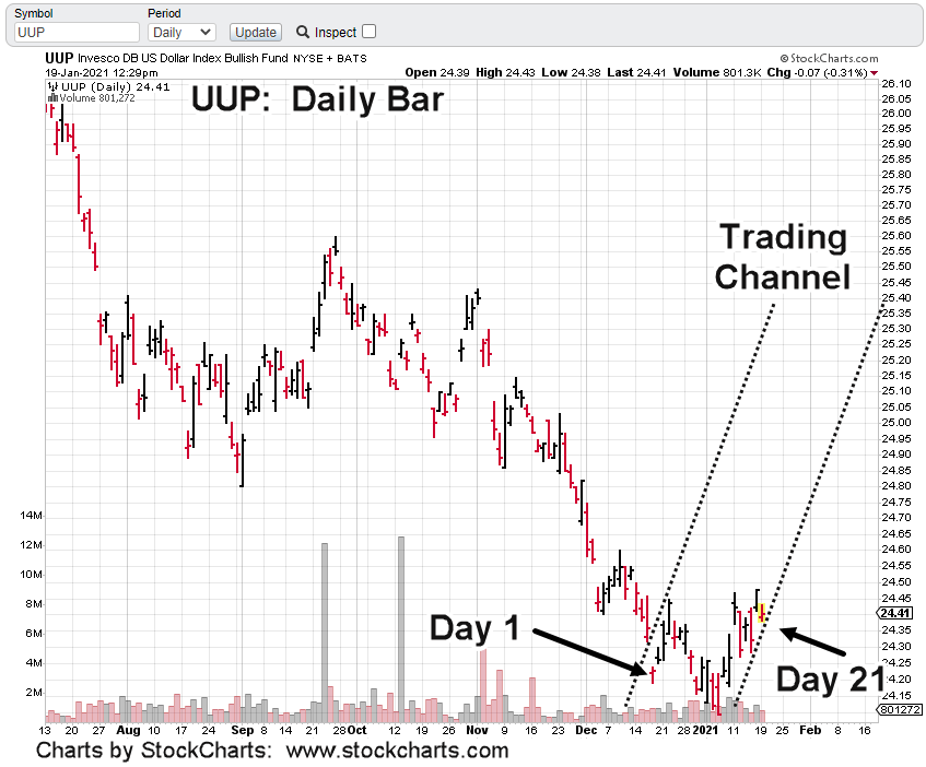 The channel shown is a Fibonacci 21-days wide; added bonus is max bottom (1/6/21), posted a Fibonacci 13 days after ‘Day 1’.