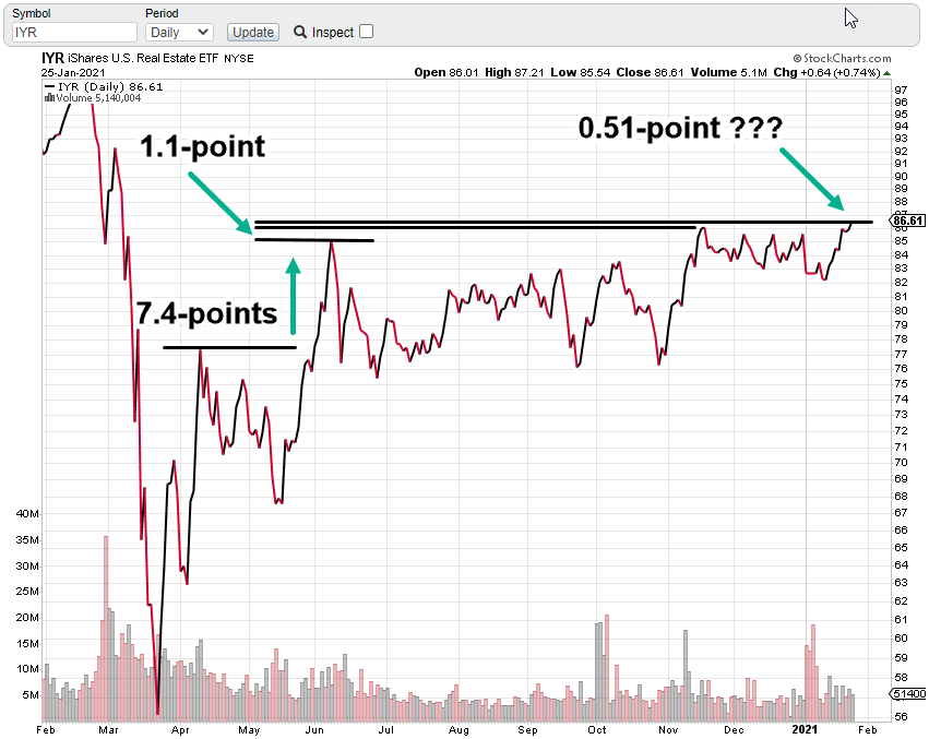 We’ll see if somehow IYR is going to break out of the six-month sideways action, continuing higher or if this is it; no more upside.