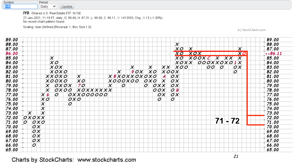 There’s enough congestion in IYR to build significant downside objectives. If we’re at a sustained reversal, then as IYR passes through the 78 – 82 area, it builds even more downside potential.