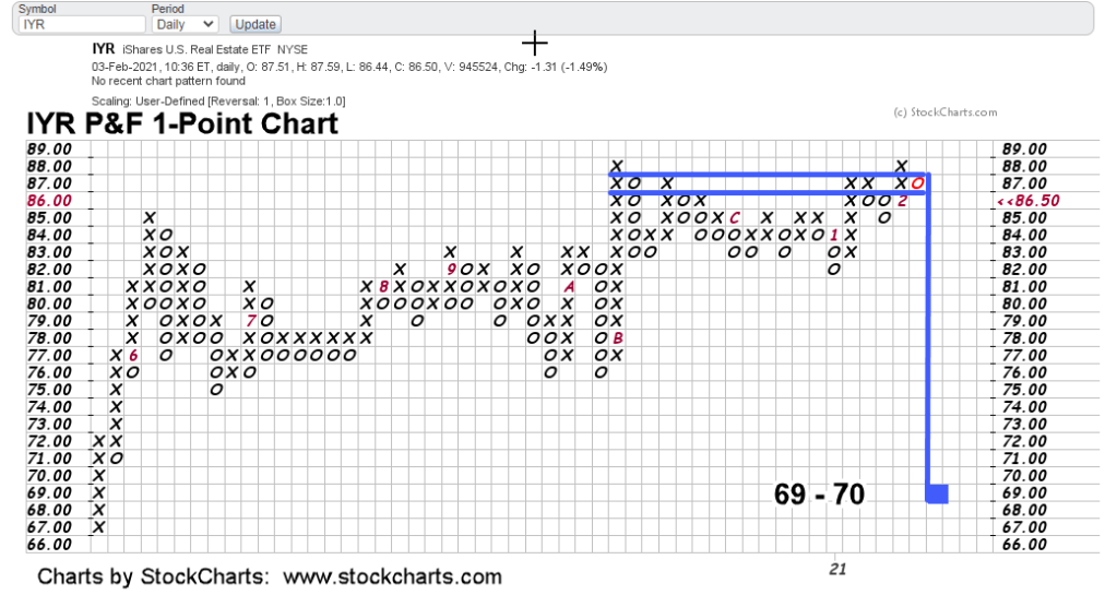 Initial target because as (and if) IYR moves down, it generates even lower targets having posted prior congestion in the 76 – 82, chart area.