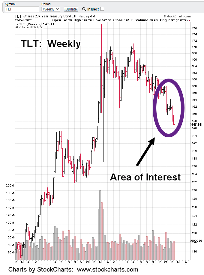 The weekly chart of TLT shows the area we’re going to look at a bit closer.