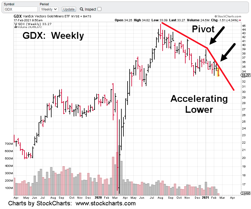 With GDX posting a new weekly low (below 33.23) early this session, it’s helping to confirm a pivot and acceleration to the downside.