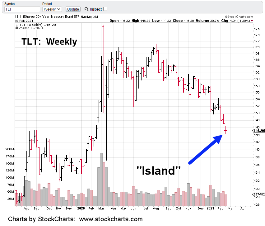 If bonds (TLT) finishes the day essentially where it started, it will have printed an island bar on the weekly chart.