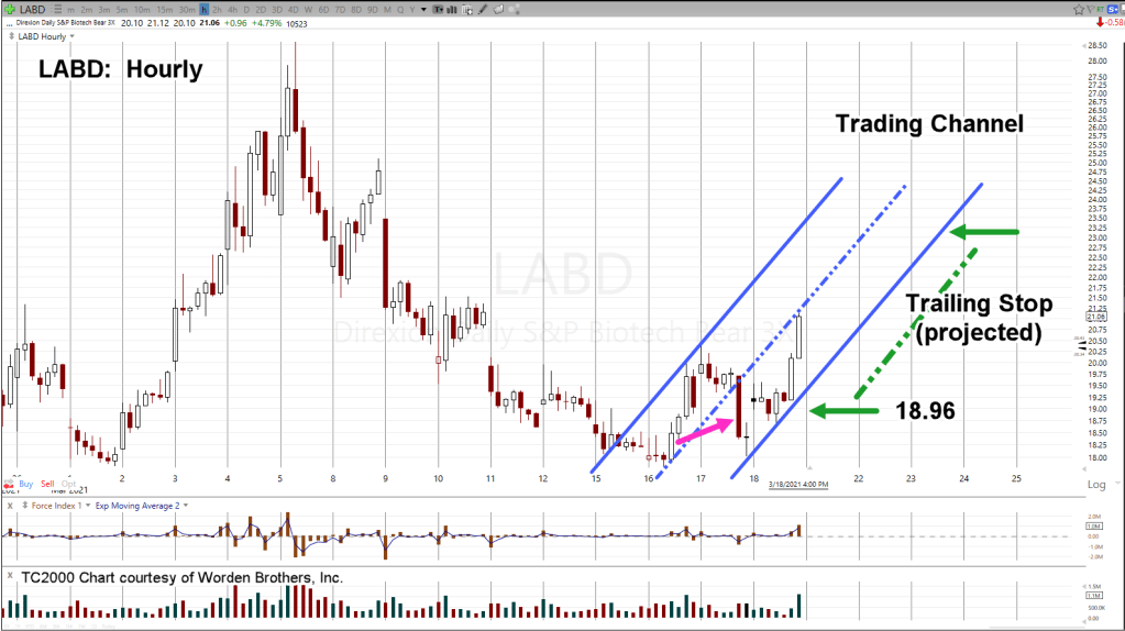 The magenta bar shows the entry at LABD 18.835 (not advice, not a recommendation) opened during the Fed speech this past Wednesday.