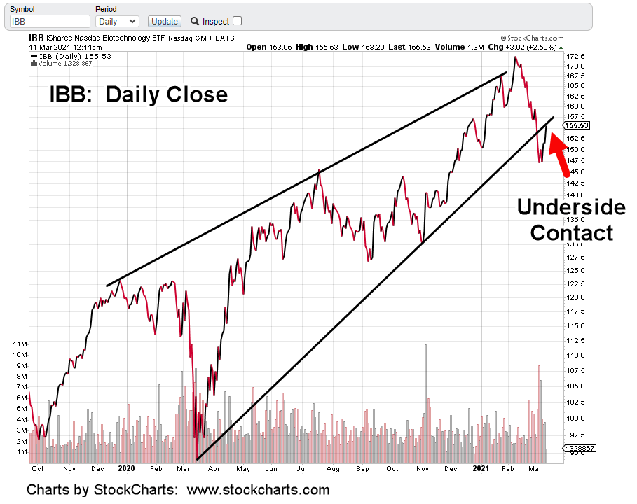 IBB’s been in a terminating wedge for over a year. There was a ‘throw-over’ in February. Next, was downside penetration of the lower boundary. Now, we’re in a test.