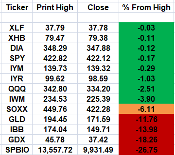 In fact, if we look at the table of tracked markets below, biotech’s SPBIO, has taken over downside leadership.