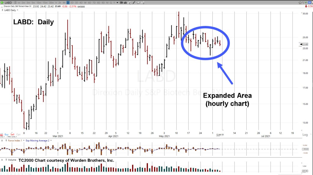 The circled area on LABD, in the daily chart is shown on the hourly below: