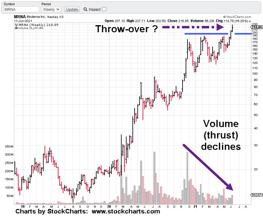 MRNA has pushed above resistance on declining volume (shown above) . The next chart has MRNA in a terminating wedge pattern: