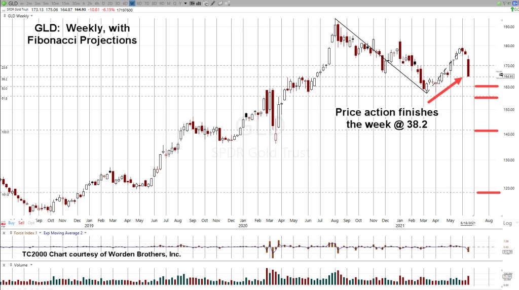 The weekly chart of GLD (above) has the index closing right at the Fibonacci 38.2%, projected level.