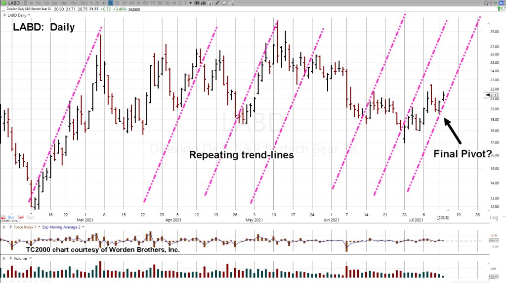 The daily chart of (inverse fund) LABD is below. The market itself is showing us it wants to follow the repeating pattern of trendlines (not advice, not a recommendation).