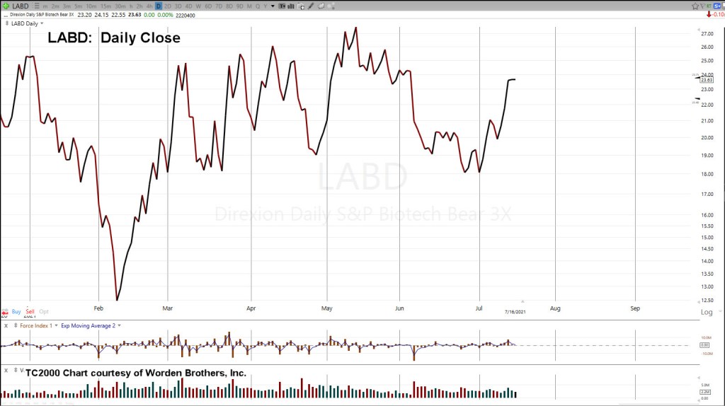 We’ll start as Weis does in the video link, with an un-marked chart. Daily close of inverse fund LABD: