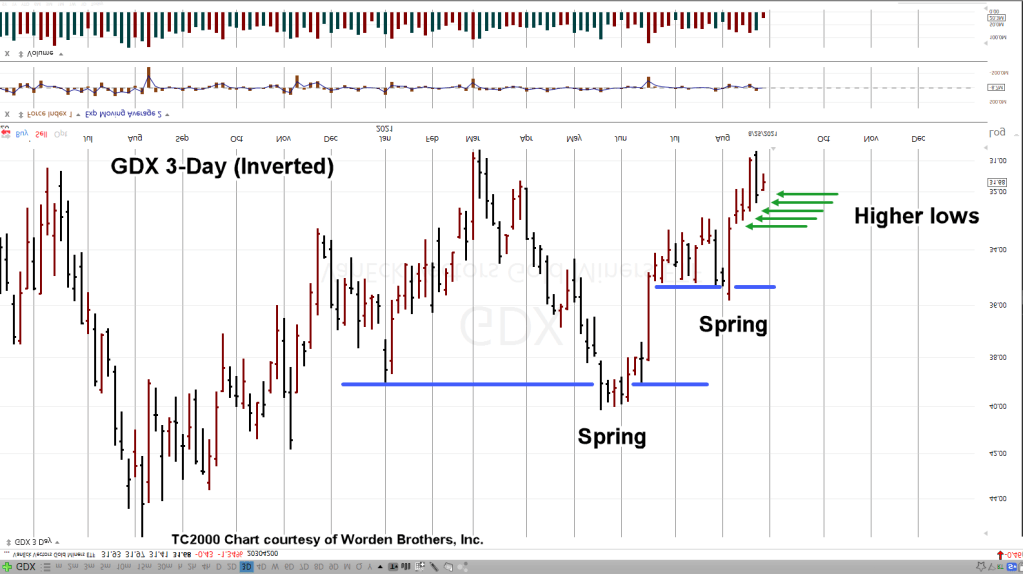 All of a sudden, it becomes clear. Inverted GDX has been in a series of springs (up-thrust, non-inverted) and is now pivoting to the upside. That pivot is shown with the green arrows.