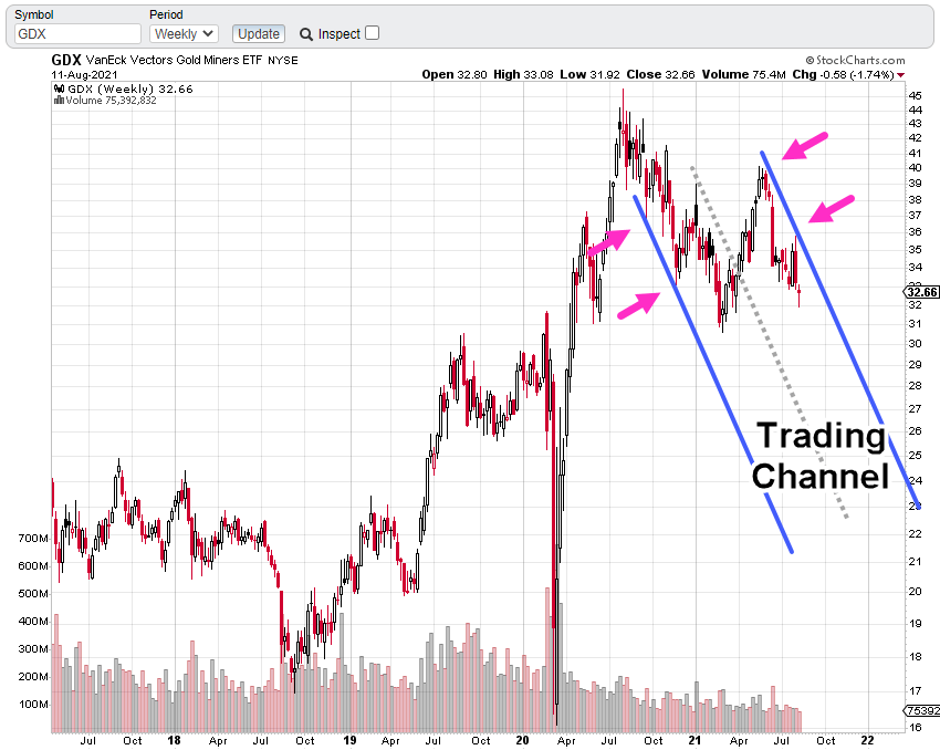 Pulling out to look at the weekly time frame, it’s clear, GDX is in a down-channel.
