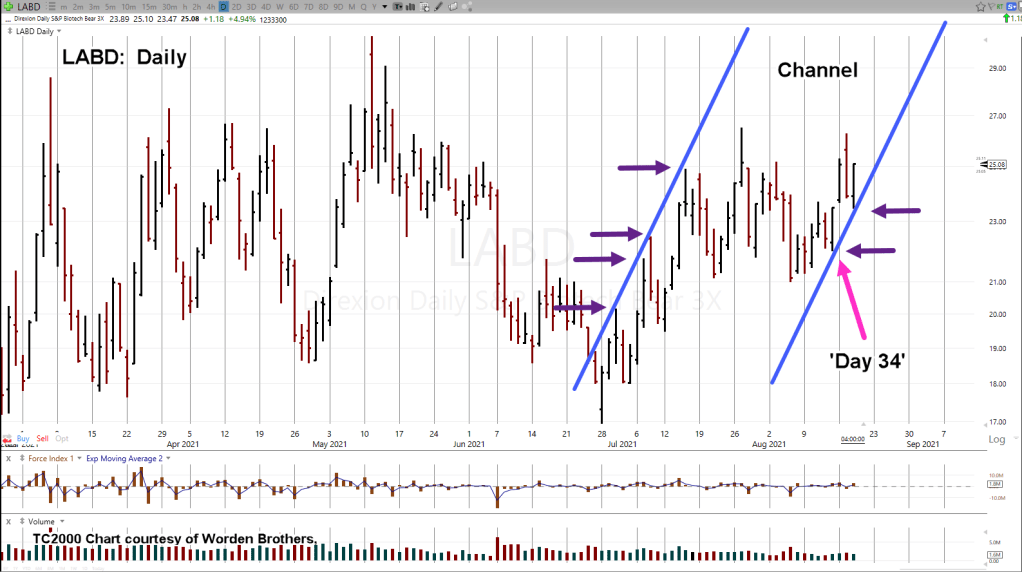 For months, the biotech SPBIO and its leveraged inverse fund LABD have shown a repeating trendline characteristic.