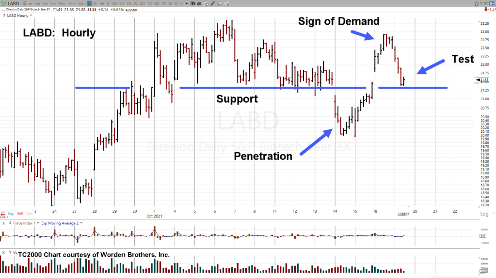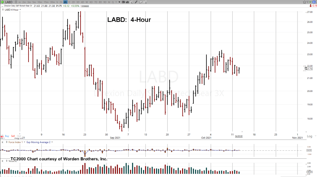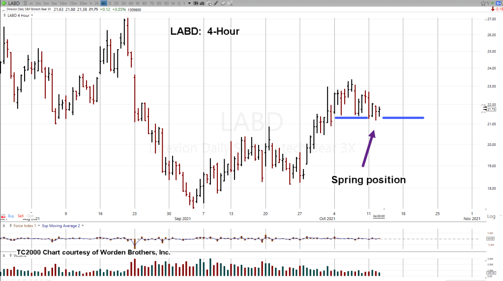 Because LABD, price action has hit the 21.40 area three times and rebounded, … it could, … could head lower for a penetration and spring set-up.