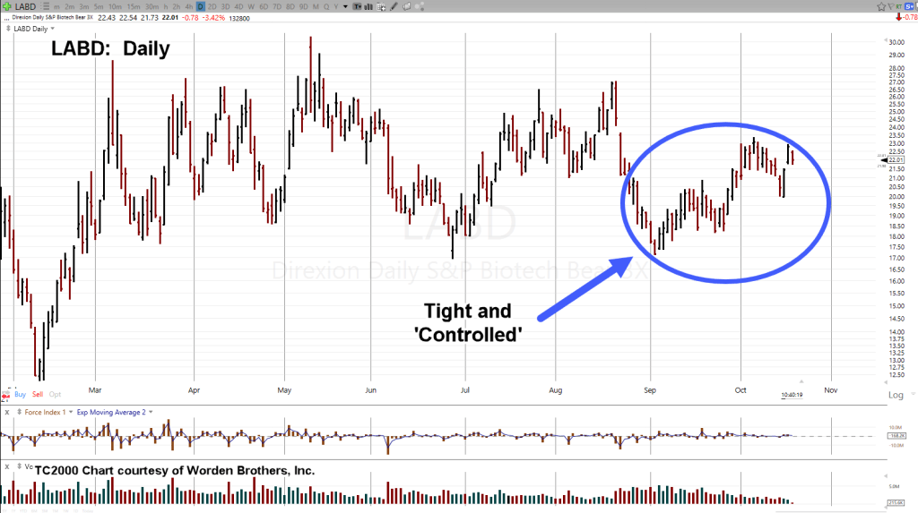 As this post is being created, LABD is moving up off the test lows. So far, overall price action has been well behaved.