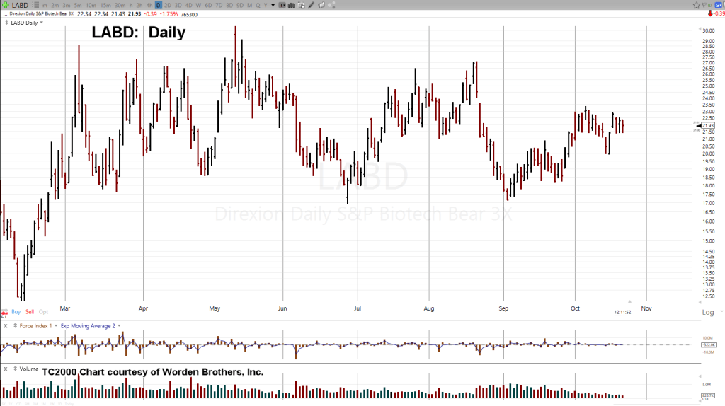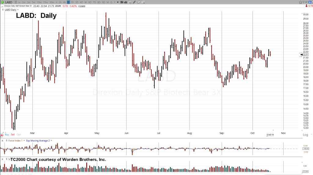 We’ll start with the un-marked daily chart of leveraged inverse fund LABD: