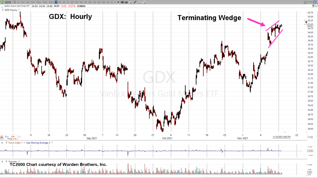 The Miner’s chart above, GDX has a potential terminating wedge as shown. The chart below zooms in on that area: