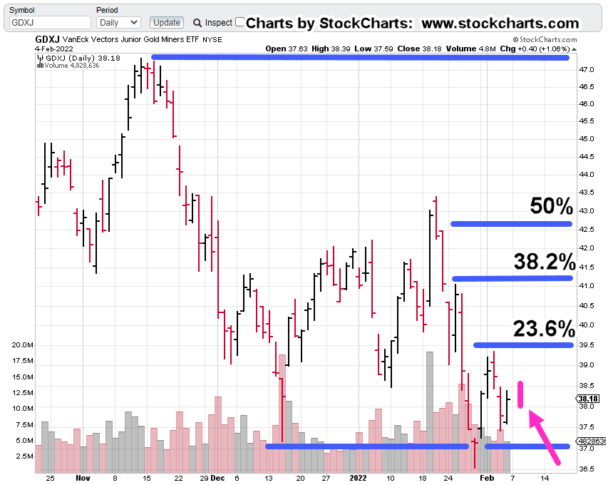 On a print basis, it’s been a Fibonacci 55 (+1) days from the GDXJ print high on November 12th, 2021, to the high posted today (2/2/22).