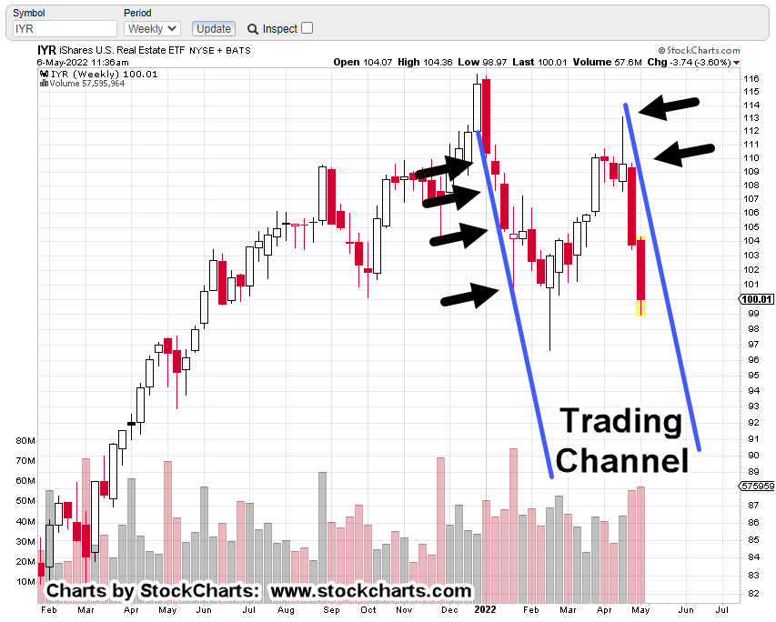 Real estate’s IYR, is trading in a channel that’s declining at around -94%, annualized.