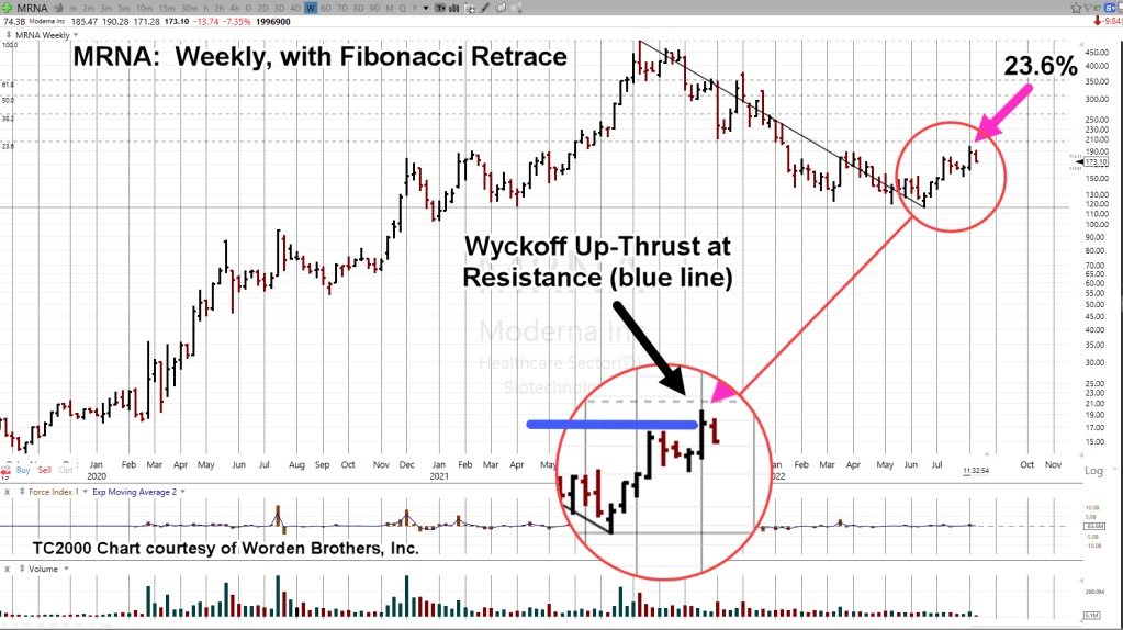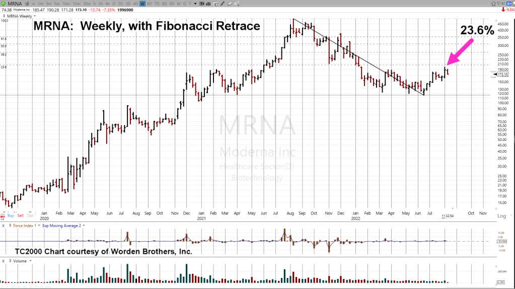 Starting with the weekly chart, MRNA, has just barely retraced upward to an anemic 23.6%, before breaking to the downside.