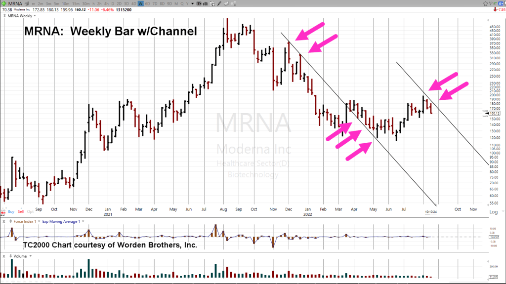 It took seven trading days for MRNA, to post a new weekly low below 160.06.