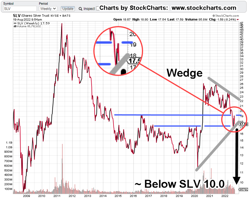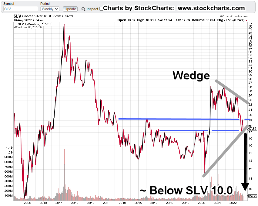 If SLV posts a decisive break below the wedge boundary, standard traditional charting technique provides a downside target in the vicinity of SLV 10.0, or slightly below.