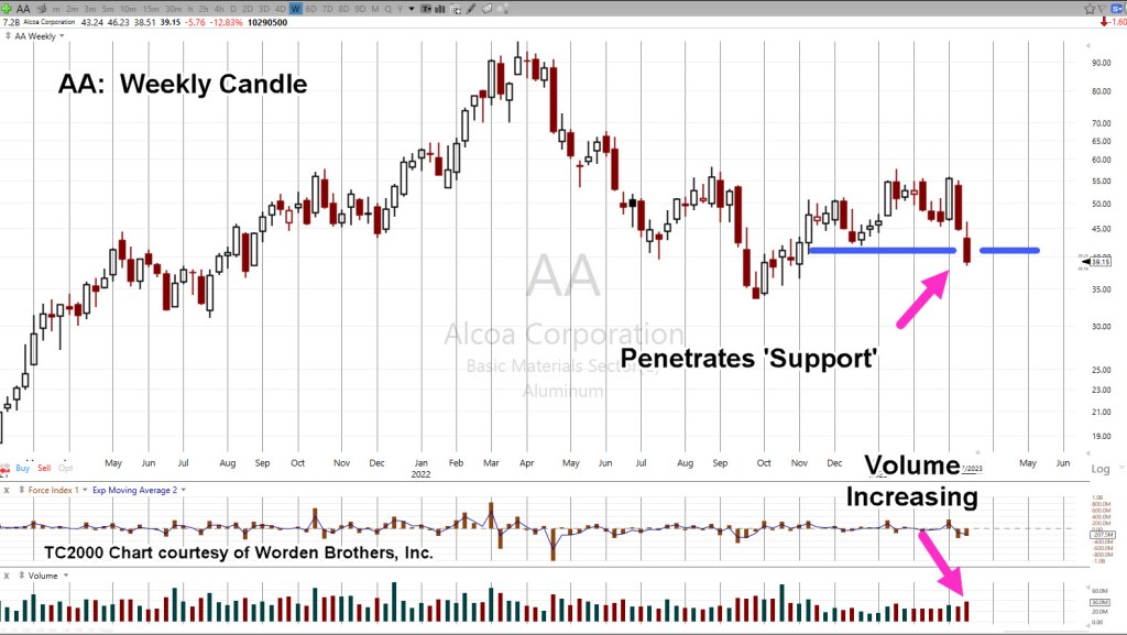 On the weekly chart, we see price action penetrated support with volume increasing.