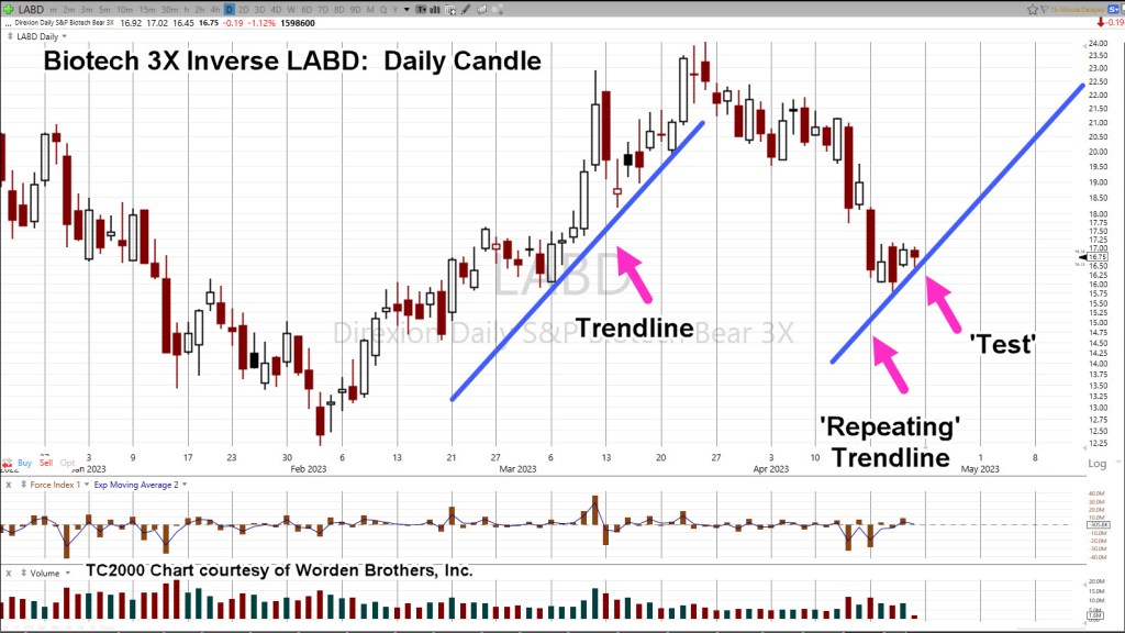 Lastly, going to the 3X Leveraged Inverse Fund LABD, on the daily timeframe, it shows a repeating trendline that may be in confirmation during this session (currently, 11:15 a.m. EST).