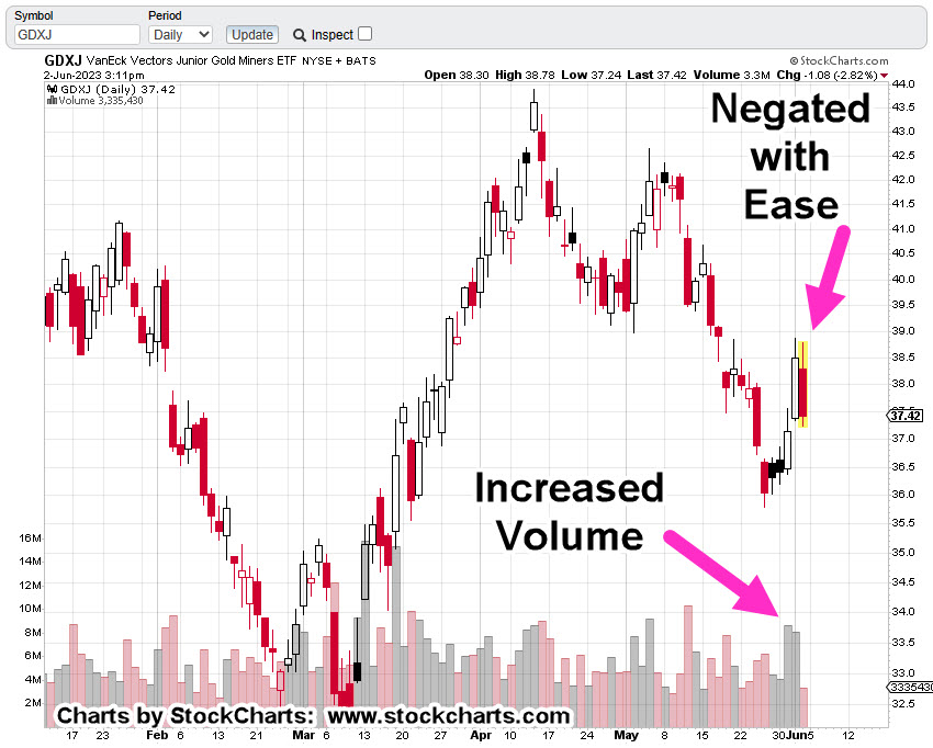 For the past two days Junior Miners GDXJ, launched higher on increased volume and then whacked itself right into resistance.