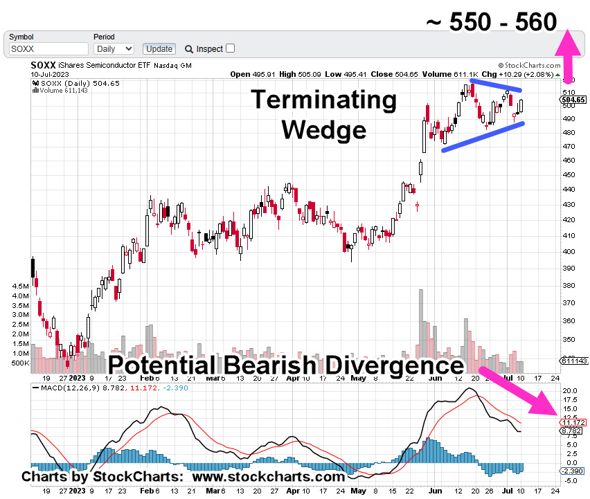 Now, it looks like we’re going into a terminating wedge targeting SOXX higher to approximately 550 – 560 (not advice, not a recommendation).