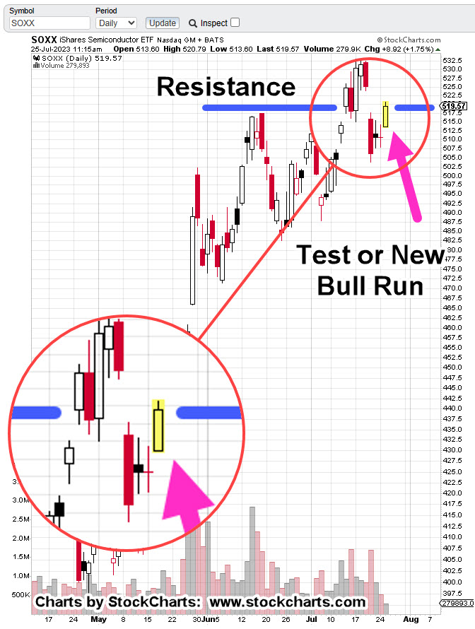 Depending on how the market closes the session (currently, 11:35 a.m., EST), the stop on the short position (via SOXS) may be moved higher (not advice, not a recommendation).
