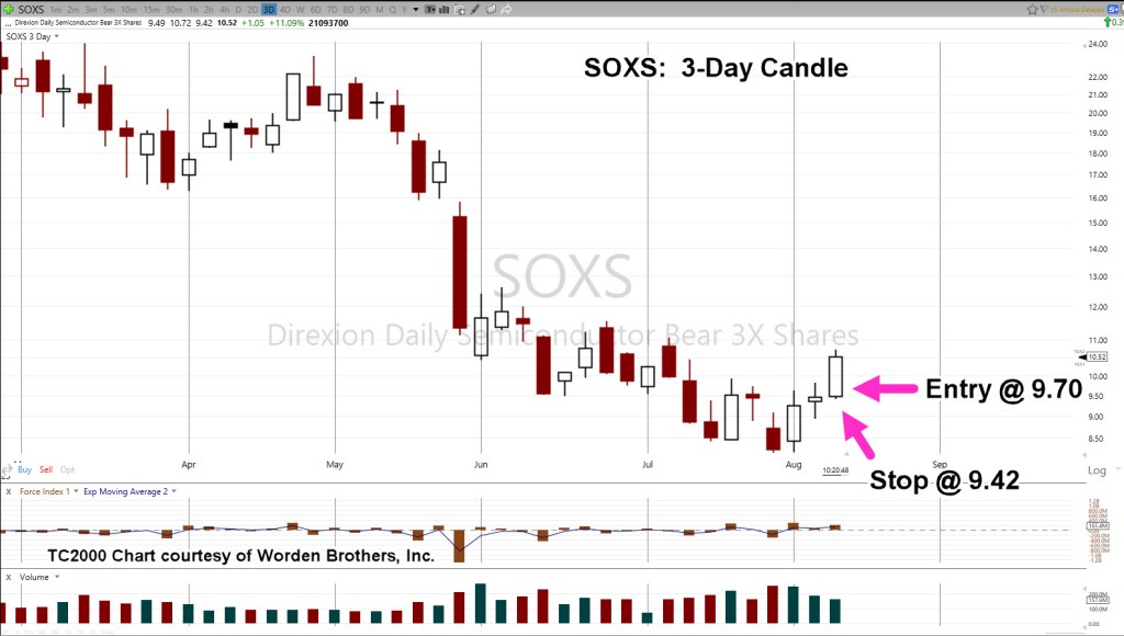 With that said, we’ll shift gears a bit and go straight to the leveraged inverse fund SOXS, but use a 3-Day chart.