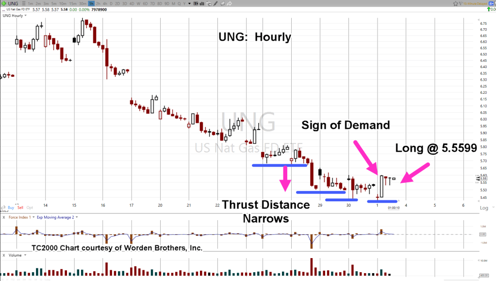 An hour-long upside bar shows ‘Sign of Demand’ and then a shallow retrace.